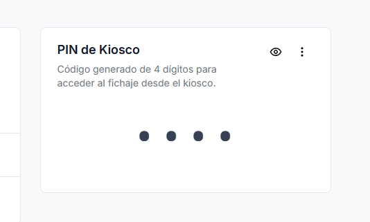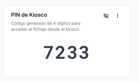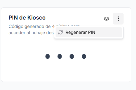 Administrativamente puede configurar y consultar el pin de acceso al kiosco. Son 4 dígitos que debe introducir el empleado o empleada para fichar y se pueden regenerar en cualquier momento que se desee.